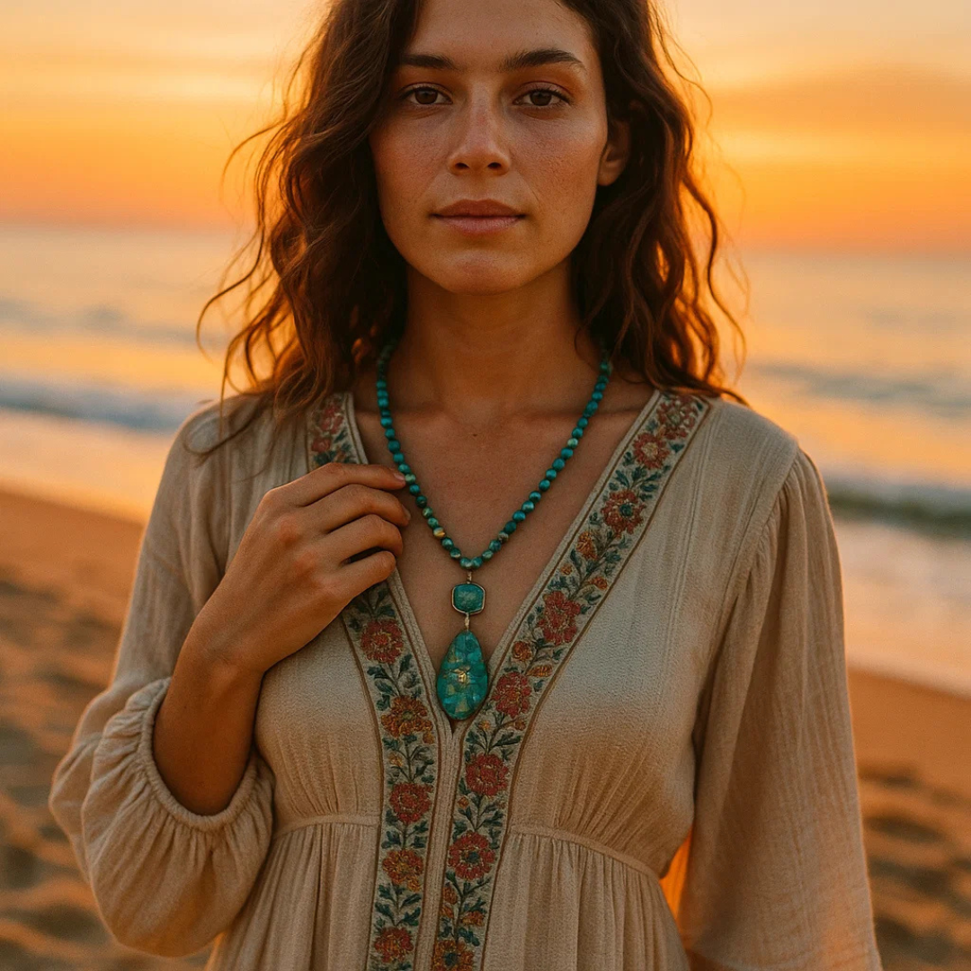 Golden accents wrap around the pendant like sunlight on stone, offering warmth and richness with every movement. Suspended from a refined beaded chain, it sits gently along the collarbone — commanding, but never loud.